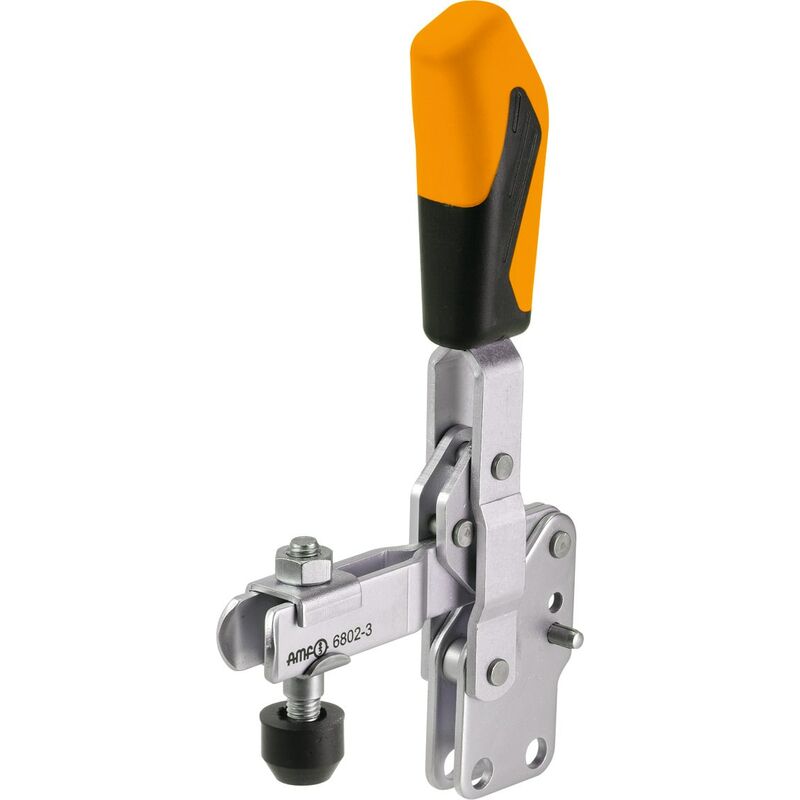 Con piede verticale per il fissaggio su traverse e per strutture saldate. * Struttura compatta grazie ad una nuova impugnatura. * Impugnatura ergonomica bicomponente estremamente pratica grazie alla superficie più ampia. * Sicurezza antisganciamento per vite di pressione. * Protezione di contatto grazie al pezzo di serraggio di sicurezza che non permette di intervenire. Uso: Per serrare e liberare rapidamente il pezzo nelle lavorazioni di serie o per l'impiego in dispositivi di serraggio speciali. Adatto per il serraggio per foratura, alesatura, rettifica, piegatura, saldatura, montaggio, ecc. Dati tecnici Tipo di prodotto Dispositivo di fissaggio rapido a doppia leva Lunghezza complessiva, mm 61 Altezza di serraggio H, mm 23,5 - 25 Modello 6802J Altezza complessiva, mm 109 Distanza fori e, mm 16 ⌀ Foro d, mm 4,5 Forza di tenuta P1, N 600 Forza di tenuta P2, N 1.100 Vite di pressione, mm M5x30