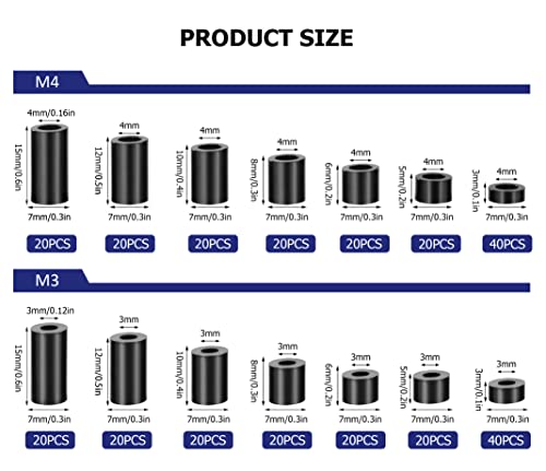 Distanziali Rotondi Nero Distanziatori Isolanti Kit Assortimento di Rondelle Distanziali ABS per Viti M3, M4 320 Pezzi