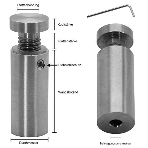 Distanziatore distanziale Muro Spacer Plug in acciaio inox fissaggio montaggio per vetro acrilico Ø 1,6cm indoor outdoor, variant:4 Stück - 1.6cm x 6 cm
