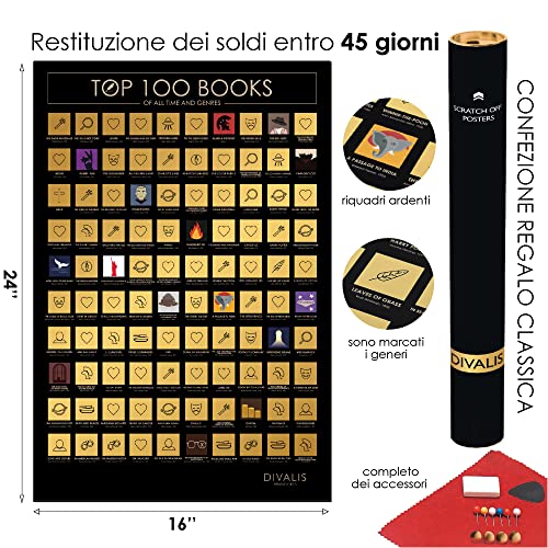 Divalis Gratta la Lista dei Libri - Libri da Grattare - Lista dei Desideri di Libri - Libri Lista Secchio - Deve Leggere Libri - Top 100 Books Scratch off Poster Bucket List - Best Books Checklist