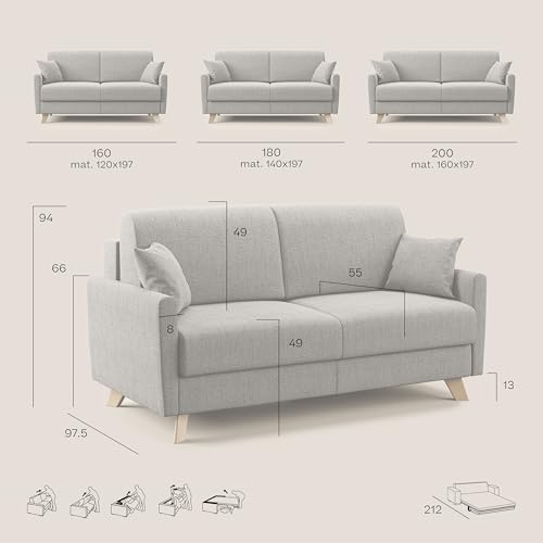 MISURE: Larghezza divano letto 160/180/200 Cm, Lunghezza divano letto 160 Cm, Altezza divano letto 90 Cm, Altezza seduta 48 Cm, Profondità seduta 59 Cm, Altezza materasso 13 Cm