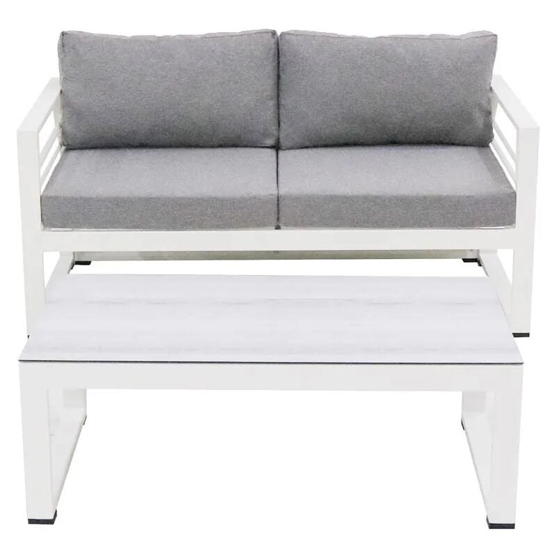 Leros è un divano in alluminio per spazi aperti con cuscineria sfoderabile composto da: divano 2 posti tavolino Il tutto in tessuto idrorepellente sfoderabile e resistente agli agenti naturali Possibilità di composizioni parziali e personalizzate.