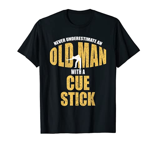 Questo design elegante per uomo presenta un giocatore di biliardo in azione con il divertente detto "Non sottovalutare mai un vecchio con una stecca"