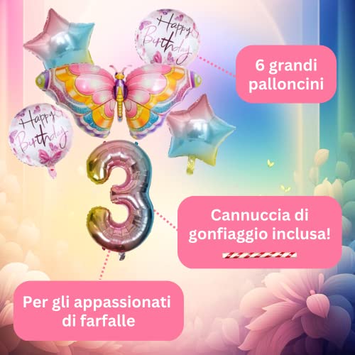 SET DI PALLONCINI A TEMA FARFALLA PER 3 ANNI: 1x palloncino con numero 3 XL (circa 70 cm), 1x affascinante palloncino a forma di farfalla (circa 95 x 45 cm), 2x palloncini di alluminio rosa con scritta 'Happy Birthday' (circa 45 cm), 2x palloncini a forma di stella (circa 45 cm)