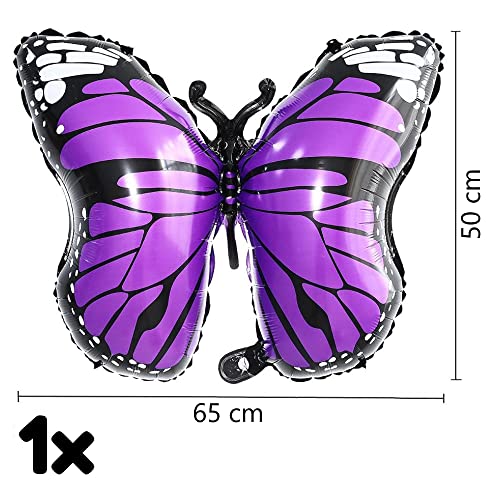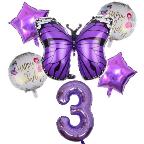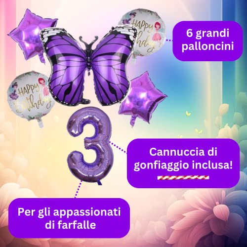 SET DI PALLONCINI A TEMA FARFALLA PER IL 3° COMPLEANNO: 1x Palloncino numero 3 XXL in lilla (circa 90 cm), 1x affascinante palloncino a forma di farfalla (circa 65 x 50 cm), 2x Palloncino di alluminio 'Happy Birthday' a tema fata (circa 45 cm), 2x Palloncino a stella lilla. (circa 45 cm)