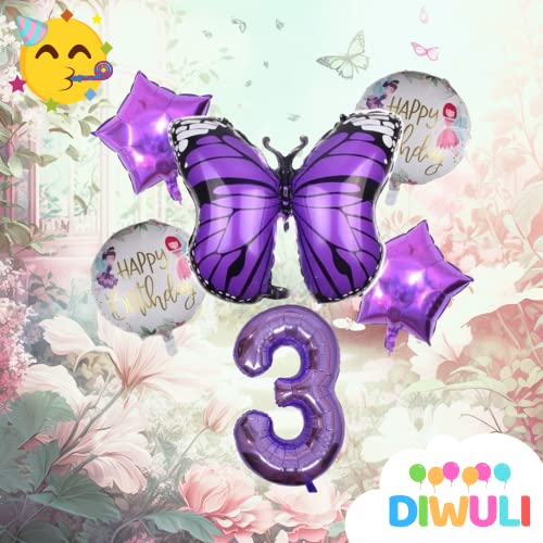 DIWULI Palloncini Farfalla 3 Anni Set - Numero 3 Palloncini Compleanno 3 Anni Viola, Decorazioni Compleanno Animali Farfalle Palloncino Pallone Bambini Bambina Ragazza Festa Decorazione Feste