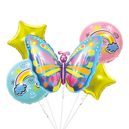 FANTASTICO SET DA 5 PEZZI: 1x palloncino a forma di farfalla (circa 75 x 45 cm), 2x palloncino a forma di nuvola arcobaleno (circa 45 cm), 2x palloncino a forma di stella dorata. (circa 45 cm)