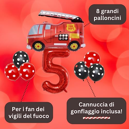 SET GRANDE DA 8 PEZZI: 1x palloncino gigante numero 5 rosso (circa 90 cm), 1x pallone in foil XL camion dei pompieri (circa 85 x 80 cm), 3x pallone in lattice rosso (circa 30 cm), 3x pallone in lattice nero. (circa 30 cm)