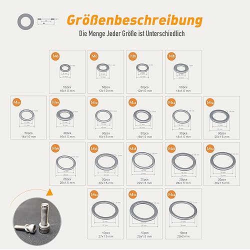 【Dimensioni e quantità】il set di guarnizioni in alluminio contiene 540 pezzi, 18 dimensioni, comprese le dimensioni delle guarnizioni in rame più comunemente utilizzate (M6 M8 M10 M12 M14 M16 M18 M20 M22 M24) per soddisfare le diverse esigenze.