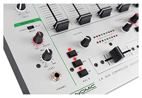 4 canali stereo: Trim, Input-Selector, 3-Band EQ con Kill-Function, 45mm Fader e LED-Meter