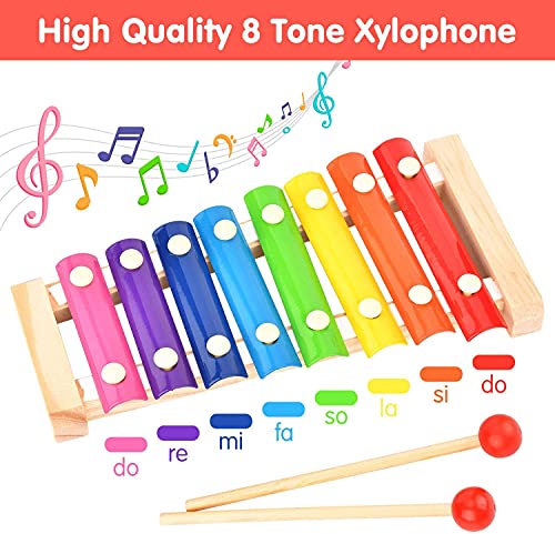 Dkinghome Strumenti Musicali per Bambini Set Ritmo Percussioni Giocattolos in Legno Xilofoni Tamburi e Percussioni Giochi Musicali per Bambini con Sacca Portaoggetti