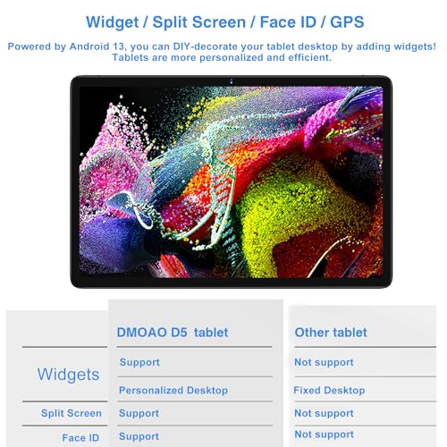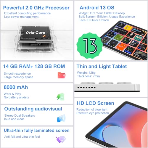 【, 】Il tablet 10 pollici è dotato del più recente sistema operativo Android 13, in grado di offrire impostazioni più personalizzate (Widget, Split Screen, Parental Controls e Face Unlocked, ecc.). Il nuovo sistema rafforza la privacy e la protezione dei dati, rendendoli più veloci e sicuri. Il tablet è dotato di un potente processore da 2,0 Ghz, che garantisce un'esperienza di utilizzo fluida e sicura del sistema e dello streaming multimediale.