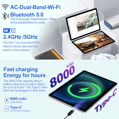 【 - + 】Il tablet android D5 consente di usufruire di una velocità di Internet fulminea grazie alla connettività WiFi 5G. Permette di rimanere facilmente connessi in movimento, offrendo un'esperienza più comoda per l'intrattenimento, la navigazione, il gioco e lo shopping. È inoltre dotato di una batteria da 8000 mAh che dura fino a 8 ore con una singola carica, 428 g e uno spessore ultrasottile di 7 mm, perfetto per gli spostamenti e i viaggi a lunga distanza.