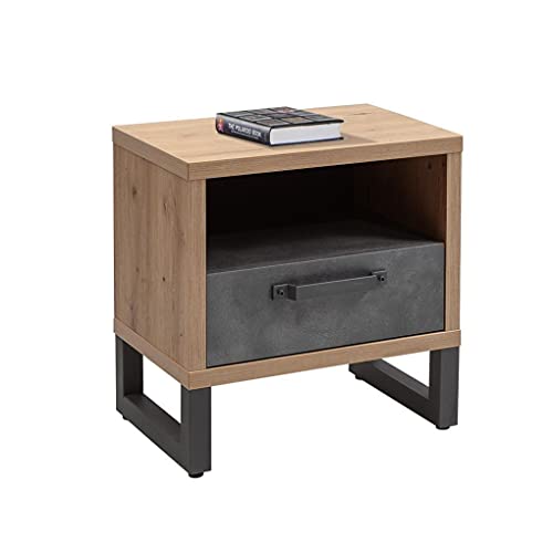 Dmora Comodino stile industrial con 1 cassetto e vano aperto, Tavolino moderno da notte, Portaoggetti, Made in Italy, cm 52x35xh54, colore Rovere e Cemento