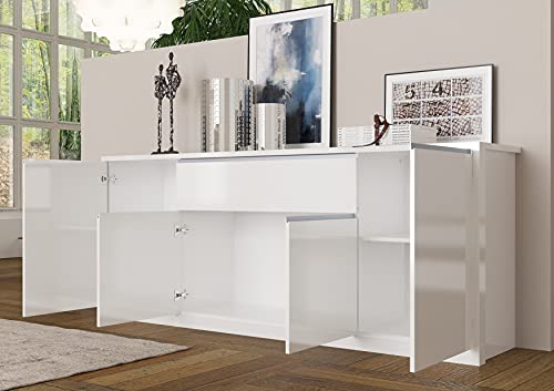 PRATICO E INNOVATIVO: Il suo design moderno ed elegante rende questa credenza con ante e cassetti perfetta da posizionare in un ambiente moderno e luminoso, in qualsiasi stanza del vostro appartamento, dall'atrio fino alla camera da letto: è il prodotto ideale per chi è alla ricerca di un articolo funzionale salvaspazio per la propria casa - La colorazione bianco lucido è innovativa e allo stesso tempo si adatta con facilità a qualsiasi tipo di ambiente