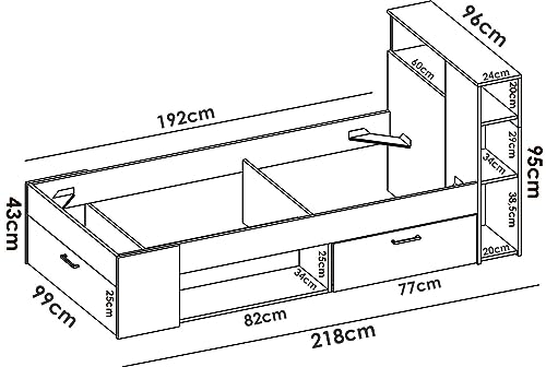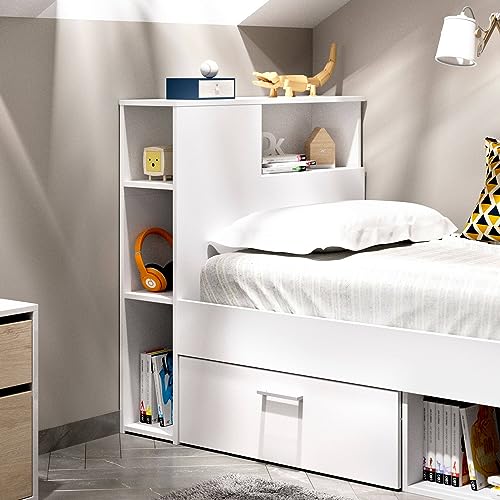 STRUTTURA E UTILIZZO - La struttura del letto è pratica e funzionale per le camerette, in quanto dispone di un cassetti e di un vano aperto, un pratico vano con anta a ribalta e una testiera con funzione di libreria - I vani inferiori sono perfetti per riporre i propri oggetti personali in modo ordinato - Il pratico cassetto salvaspazio permette di riporre lenzuola, cuscini e piumoni - Il letto singolo fornito di libreria completa la struttura