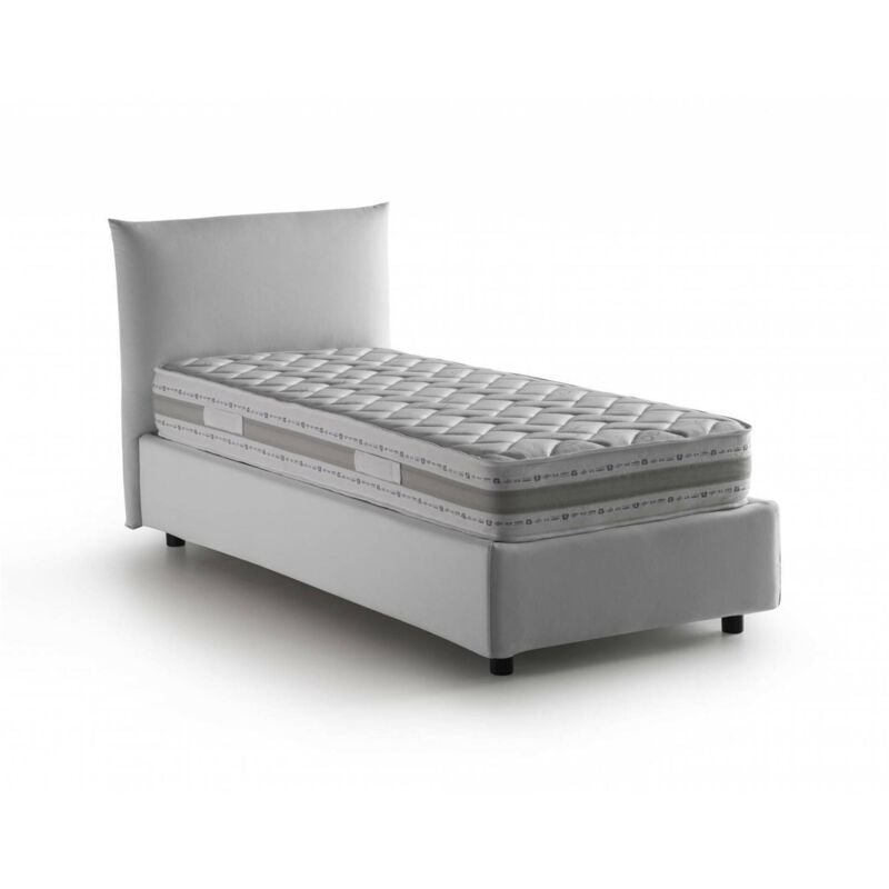 LETTO SINGOLO - Letto contenitore con rivestimento in tessuto, 100% Made in Italy, Apertura frontale, con materasso Cm 80x190 incluso, Bianco. STRUTTURA - La struttura del letto è in fibra di legno rialzata da terra con piedini in ABS ed è rivestita in morbido tessuto di poliestere sfoderabile e lavabile in lavatrice a 30° - La testiera lineare abbinata con cuciture a vista in tessuto, è solida e resistente - La rete a doghe in legno multistrato è inclusa nella struttura - Meccanismo di apertura in ferro - L'aggiunta del pratico box contenitore salvaspazio permette al letto di trasformarsi in uno spazioso cassone per lenzuola, cuscini e piumoni. MADE IN ITALY - L'articolo è prodotto in Italia, con l'impiego dei migliori materiali e la massima qualità e cura nei dettagli - L'accortezza dei processi produttivi è sinonimo di affidabilità, resistenza e raffinatezza per un design lineare ed elegante - La Certificazione Made in Italy è garanzia di piena conformità alle normative dell'Unione
