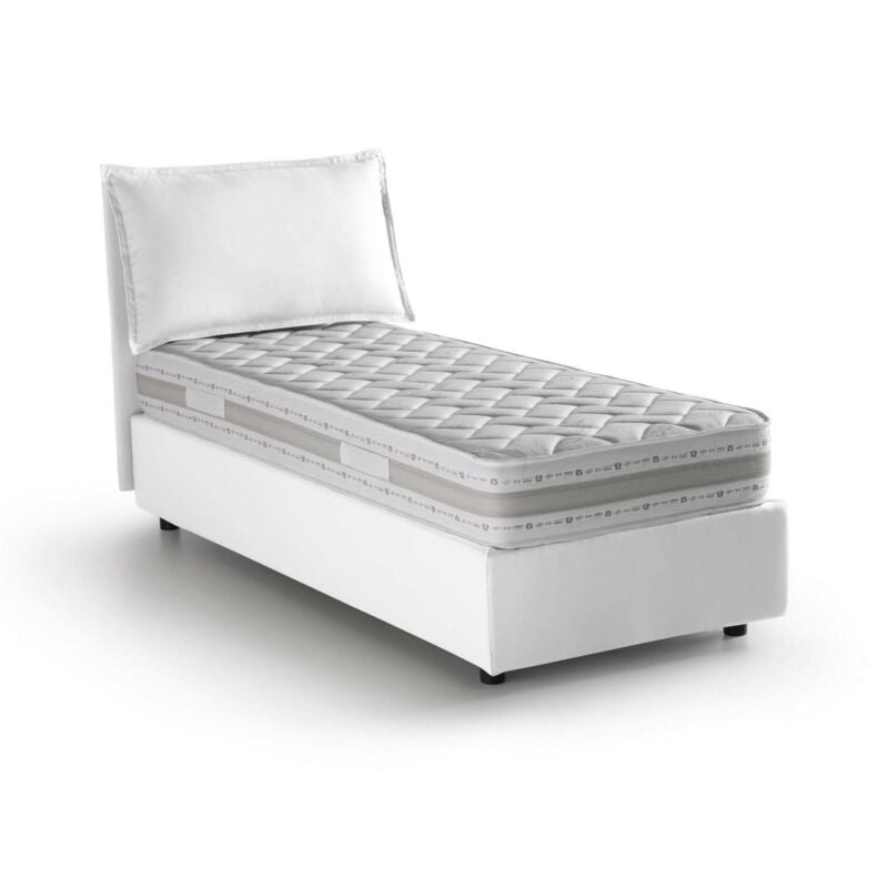 LETTO SINGOLO - Letto contenitore con rivestimento in tessuto, 100% Made in Italy, Apertura frontale, con materasso Cm 80x200 incluso, Bianco. STRUTTURA - La struttura del letto è in fibra di legno rialzata da terra con piedini in ABS ed è rivestita in tessuto di poliestere sfoderabile e lavabile in lavatrice a 30° - La testiera lineare abbinata in tessuto con cuciture a vista, è solida e resistente - La rete a doghe in legno multistrato è inclusa nella struttura - Meccanismo di apertura in ferro - L'aggiunta del pratico box salvaspazio permette al letto di trasformarsi in uno spazioso cassone per lenzuola, cuscini e piumoni. MADE IN ITALY - L'articolo è prodotto in Italia, con l'impiego dei migliori materiali e la massima qualità e cura nei dettagli - L'accortezza dei processi produttivi è sinonimo di affidabilità, resistenza e raffinatezza per un design lineare ed elegante - La Certificazione Made in Italy è garanzia di piena conformità alle normative dell'Unione Europea - Articolo