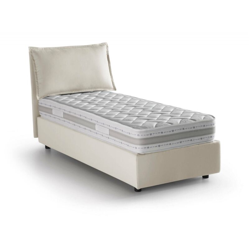 LETTO SINGOLO - Letto contenitore con rivestimento in tessuto, 100% Made in Italy, Apertura frontale, con materasso Cm 80x200 incluso, Beige. STRUTTURA - La struttura del letto è in fibra di legno rialzata da terra con piedini in ABS ed è rivestita in tessuto di poliestere sfoderabile e lavabile in lavatrice a 30° - La testiera lineare abbinata in tessuto con cuciture a vista, è solida e resistente - La rete a doghe in legno multistrato è inclusa nella struttura - Meccanismo di apertura in ferro - L'aggiunta del pratico box salvaspazio permette al letto di trasformarsi in uno spazioso cassone per lenzuola, cuscini e piumoni. MADE IN ITALY - L'articolo è prodotto in Italia, con l'impiego dei migliori materiali e la massima qualità e cura nei dettagli - L'accortezza dei processi produttivi è sinonimo di affidabilità, resistenza e raffinatezza per un design lineare ed elegante - La Certificazione Made in Italy è garanzia di piena conformità alle normative dell'Unione Europea - Articolo