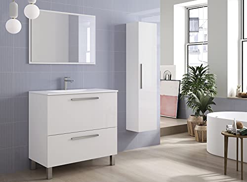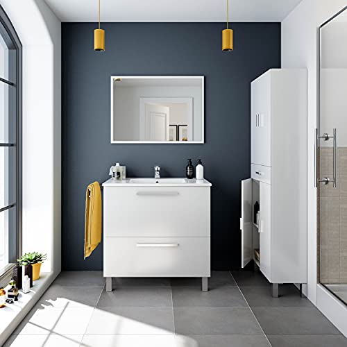 MOBILE SOTTOLAVABO HAYWARD - Mobiletto per bagno, Armadio a 2 cassetti e specchio, lavabo non incluso, cm 80x45h80, Bianco lucido
