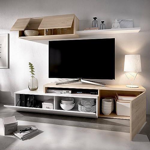 STRUTTURA E UTILIZZO - Composizione porta TV per salotto composto da una base porta televisione, un mobile portaoggetti, un pensile a muro con un'anta a ribalta in legno e vetro e una mensola - La scelta dei mobili che compongono il set rende il design di questo articolo d'arredamento funzionale e salvaspazio - Set soggiorno perfetto per arredare un salotto, sala da pranzo oppure una stanza open space
