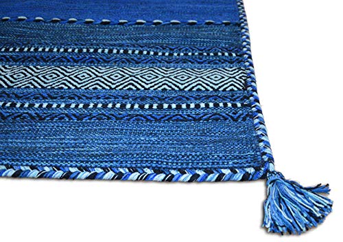 Linea di tappeti multiuso con stile classico kilim, dai colori piacevoli e dal motivo etnico, tessuto in 100% cotone, frange annodate a mano