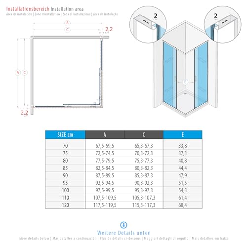 Dimensioni: le nostre cabine doccia possono essere installate su piatti doccia o direttamente sul pavimento. Dimensioni: 85 x 90 cm - dimensioni esterne minime 82 x 87 cm / dimensioni esterne massime 84 x 89 cm (se si adattano i profili a parete al massimo). Poiché la cabina doccia (vetro) non è montata sul bordo esterno del piatto doccia, la dimensione di installazione della doccia è sempre inferiore a 85x90 cm.