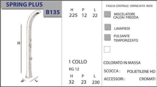 Doccia tradizionale Arkema Spring Plus Bianca con banda Inox Doppio attacco per acqua calda e fredda Doccia per interni e esterni in Polietilene HD con Miscelatore, Pulsante temporizzato e Lavapiedi