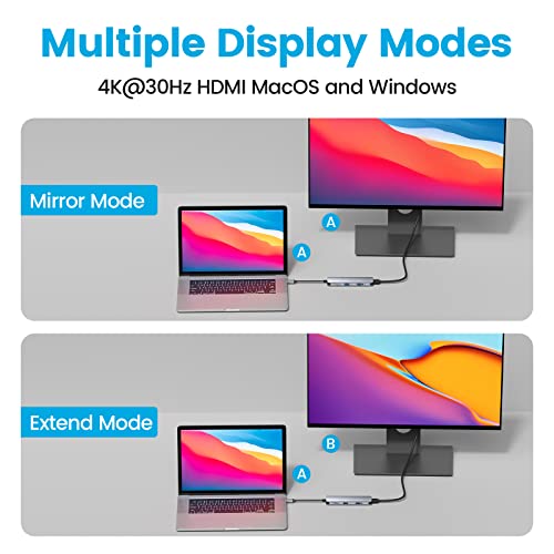 【USB C Adapter 4K HDMI】: L'HUB USB-C supporta risoluzioni elevate fino a 4K 3840x2160@30Hz e trasmette video 4K o Full HD 1080p direttamente a HDTV, monitor o proiettori ed è retrocompatibile con le risoluzioni 2K/1080p/720p. L'hub Type-C supporta anche OTG, che consente di trasferire file/immagini/video direttamente allo smartphone. Si prega di notare che è necessario alimentare l'hub tramite la porta PD, mentre si utilizza l'HDMI per ottenere prestazioni perfette!
