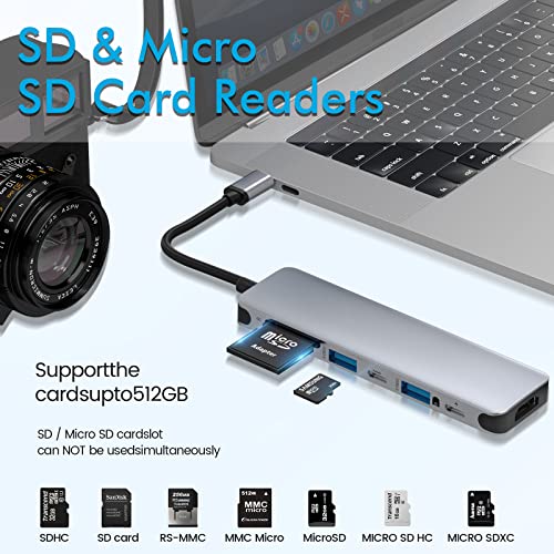 【USB C HUB 7 IN 1】 Il dock hub USB-C è compatibile con tutti i dispositivi contenenti porte Type-C / USB, compresi MacBook Pro e Air. Il dock USB-C 7 in 1 include una porta USB 3.0 e una USB 2.0, una porta USB-C, una porta PD, una porta HDMI 4K e slot per lettori di schede SD/Micro SD, compatibili con MacBook Pro/Air, Chromebook e altri dispositivi Type-C. In questo modo è possibile risolvere il problema di un'unica interfaccia per laptop in qualsiasi momento e ovunque.