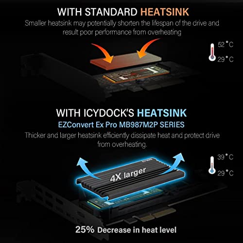 Icy Dock EZConvert Ex PRO MB987M2P-1B Adattatore PCIe con dissipatore di Calore, Scheda PCIe per SSD M.2 NVMe a PCIe 4.0 X16/X8/X4, Compatibile con SSD, velocità di trasferimento Fino a 64 GBP/s