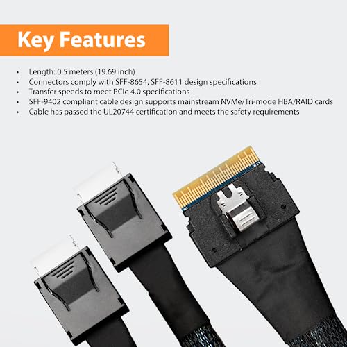I connettori sono conformi alle specifiche di progettazione SFF-8654, SFF-8611, il design del cavo conforme a SFF-9402 supporta le comuni schede NVMe/Tri-Mode HBA/RAID
