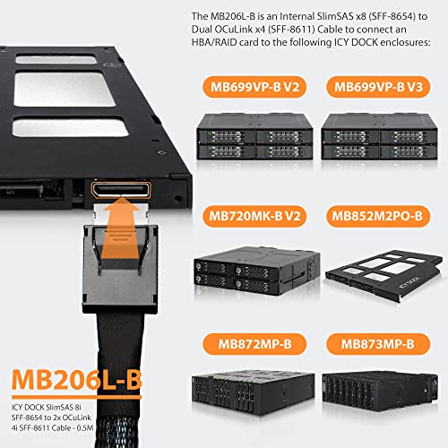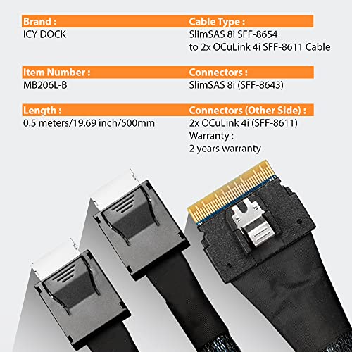 Icy Dock MB206L-B Cavo SlimSAS 8i SFF-8654 a 2 x OCuLink 4i SFF-8611 per collegare la scheda HBA/RAID al rack mobile o al box esterno SSD NVMe - 0,5 m