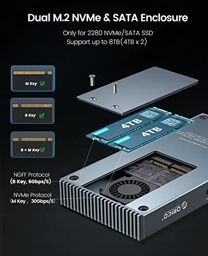 【Dock Thunderbolt 3 e doppio alloggiamento NVMe/NGFF M.2】 L'hub Thunderbolt 3 ORICO ha due slot M.2 (posteriori) utilizzati rispettivamente per SSD NVMe e SSD SATA. Slot SSD NVMe: per SSD con protocollo M.2 M-Key 2280 (NVMe), 30 Gbps max, supporta fino a 4 TB. Slot SSD SATA: per SSD con protocollo M.2 B-Key 2280 SATA (NGFF), fino a 6 Gbps, fino a 4 TB (Nota: questo slot dual-bay non supporta SSD che utilizzano lo stesso protocollo).