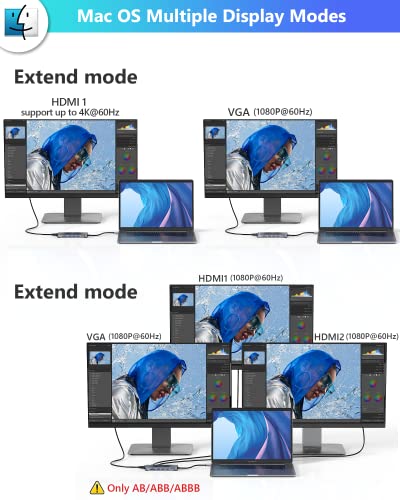Docking station doppio monitor 2 HDMI (4k) e triplo monitor VGA (1080P): HDMI 1 monouso può essere fino a 4K a 60 Hz con sorgente DP1.4. Quando si collegano 2 monitor, la doppia risoluzione HDMI sarà 4K a 30Hz e 2K a 60Hz (DP1.4). L'uscita del display sarà 1080P@60Hz quando display doppio o triplo con VGA. Con questa docking station lenovo thinkpad, puoi gestire facilmente la configurazione multi-schermo, rendendo il tuo lavoro o la tua vita più efficiente. ★Nota: Windows supporta la modalità MST e SST, Mac OS supporta solo la modalità SST (ABB, ABBB).