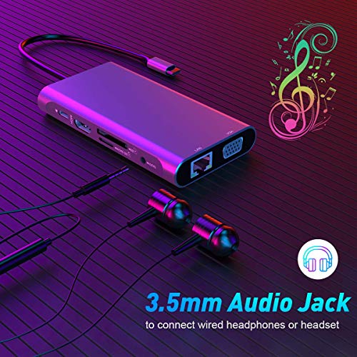Dock 10 in 1 USB C ultra portatile e potente postazione di lavoro Hub USB C multifunzione trasforma la porta USB C in uscita video 4K HDMI e 1080P VGA, Gigabit Ethernet, 3 USB 3.0, audio da 3,5 mm, porta Power Delivery di tipo C, lettore di schede SD/TF. Abbiamo sviluppato la docking station USB C per MacBook/Pro/Air, laptop di tipo C, computer portatili Windows. Progettato con un semplice plug e connettività. Docking station USB-C con doppio display, sottile e compatto senza compromettere l'accessibilità.