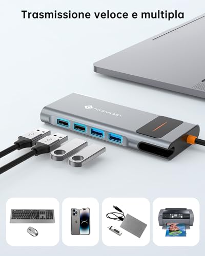 【Connettività universale】 L'hub USB C 12 in 1 NOVOO fornisce 2 USB 3.0 e 2 USB 2.0 aggiuntivi per più dispositivi USB-A come unità flash, disco rigido, tastiera, mouse, stampante, lettore MP3 e altro. USB 3.0 supporta il trasferimento di dati fino a 5 Gbit/s. RJ45 LAN fornisce una connessione stabile alla rete gigabit, consentendoti di goderti Internet ad alta velocità.