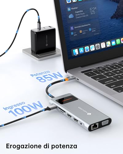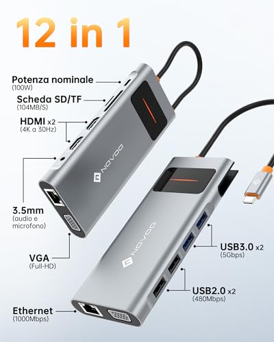 Docking Station USB C Triplo Display, NOVOO 12 in 1 Hub USB C con 2 4K HDMI, VGA, 1000Mbps Ethernet, Lettore SD/TF, 4 USB, Audio da 3,5 mm e Ricarica Rapida PD 100W per MacBook/Dell/Surface/HP