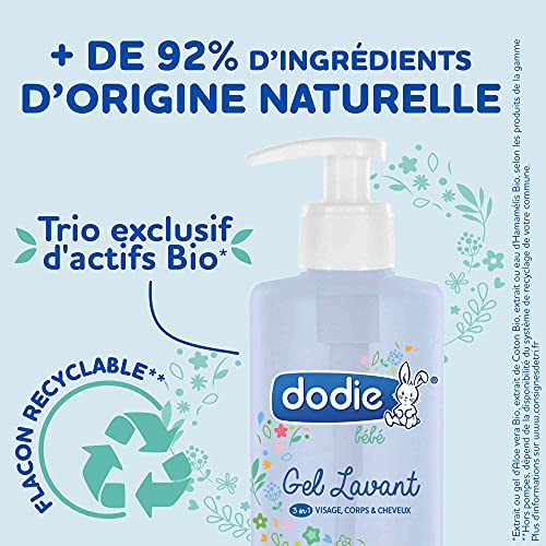 Dodie, Confezione da 3, gel Detergenti 3 in 1 (3 X 500 Ml), Detergente Viso, Corpo e Capelli, 92% di Ingredienti di Origine Naturale, Ipoallergenico, dalla Nascita