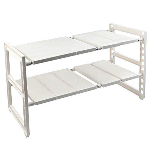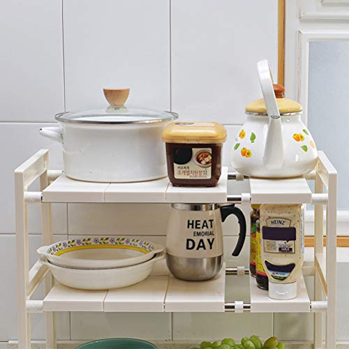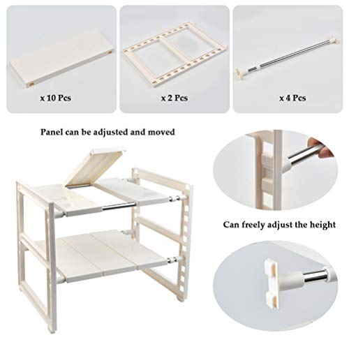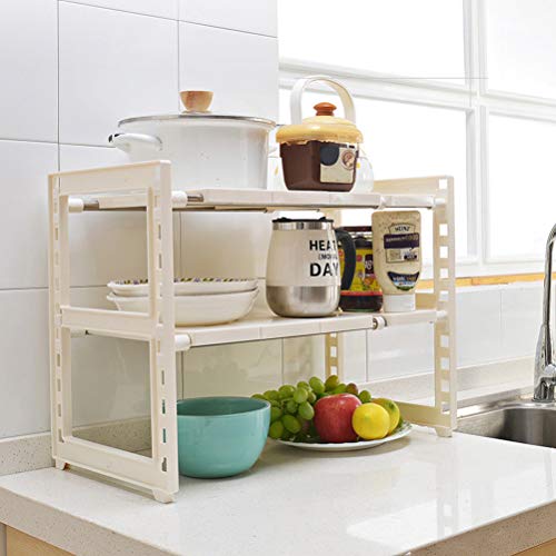 DODUOS Scaffale Estensibile Salvaspazio in Plastica Scaffale Sottolavello Regolabile in Altezza e Lunghezza Mensole Multifunzionale per Sottolavello Cucina Bagno (Beige)