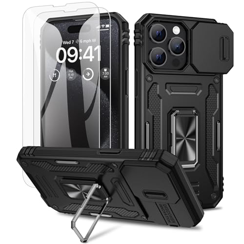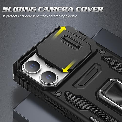 Doeshine Cover iPhone 15 Pro Max, con 2 Pellicola Vetro Temperato, 360° Metallo Rotante Anello, Cover per Fotocamera Scorrevole, TPU Bumper Case Custodia per iPhone 15 Pro Max 5G (Nero)