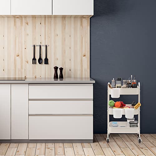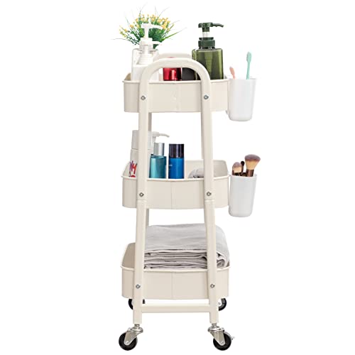 DOEWORKS Carrelli Portaoggetti in Metallo Carrello Cucina con Tazze a 3 Ripiani, Organizer Carrello Scaffale con Ruote per Cucina Bagno Ufficio, Bianca