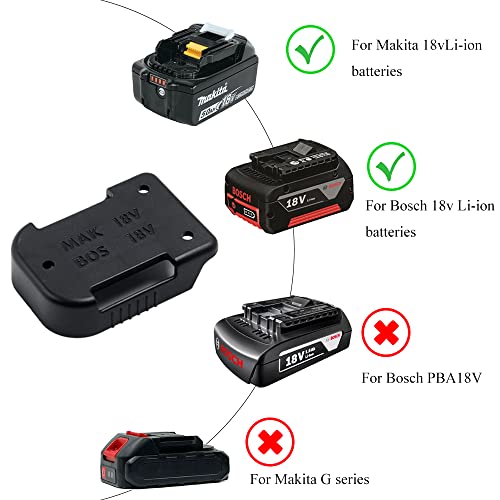 【Adatta】 Il supporto della batteria è comodo da posizionare nella maggior parte dei luoghi. Può essere installato a parete, mensola e tavolo. Può anche essere installato nella cassetta degli attrezzi. Può essere appeso alla cintura, il che è pratico quando si lavora. Il supporto della batteria è adatto per batterie Makita 18v e Bosch 18v agli ioni di litio, ecc. La dose del supporto della batteria non è adatta per la serie Makita G e Bosch PBA18V.