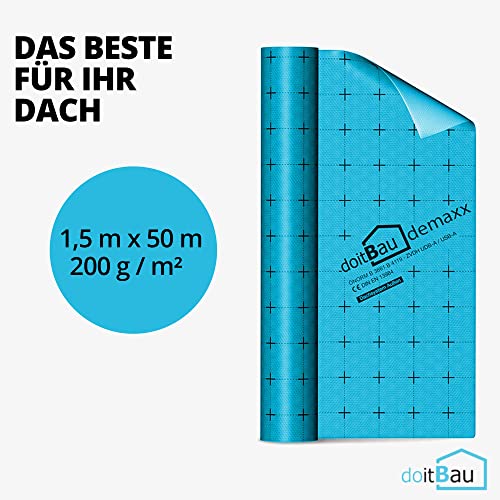 Produttore: doitBau. Struttura del prodotto: 3 strati. Materiale tessuto non tessuto: polipropilene. Grammatura: 200 g/m². Valore SD: < 0,02 m. Classe di combustibile E. Intervallo di temperatura: -40°/+90°C. Resistente alle intemperie: 3 mesi. Dotazione: con due strisce autoadesive. Larghezza x lunghezza: 1,5 m x 50 m. Contenuto della confezione: un rotolo (75 m²)