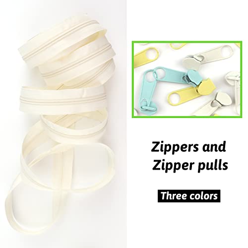 Cerniera da 15 metri in 3 diversi colori (1 verde menta chiaro, 1 giallo pallido, 1 bianco latte) ciascuna con una lunghezza di 5 m e 30 tiretti abbinati (10 tiretti per colore) come da immagine.