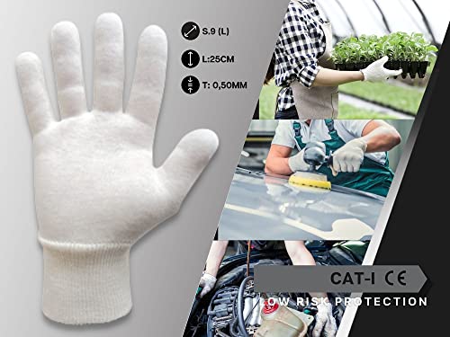 ⚙️ I guanti per lavoro in tessuto pregiato hanno una taglia unica (taglia 9). Vantano un materiale resistente e durevole. I guanti di cotone dermatologici non sono lavabili o impermeabili. Questo DPI è stato fabbricato in conformità alle disposizioni della Direttiva del Consiglio 89/686/CEE e in particolare alla norma EN 420.