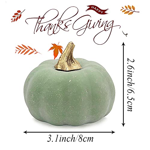 Ogni zucca misura 8 x 7 cm. La zucca è un bel colore salvia con un gambo dorato, attirerà l'attenzione in ogni occasione.