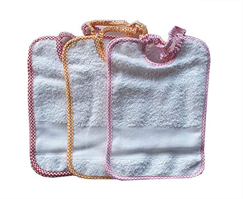 OM DOLCE CASA Bavaglie Con Elastico e Tela Aida per Ricamo a Punto Croce Neonata MISURA MEDIA CM 25,50X20 Set da 6 pezzi Colore Rosso Rosa Giallo 100% COTONE Produzione Italiana (bimba)