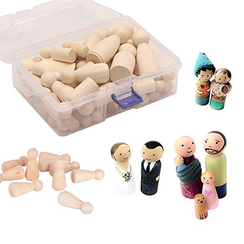 Peg Doll Legno, 50 Pcs Bambole Legno Peg, Set di Bambole di Legno Non Finite Fai da Te Peg Doll 35mm 43mm 55mm 65mm per Famiglia Felice Gioccatoli Creativi (con Scatola Trasparente/Pittura, Intaglio)