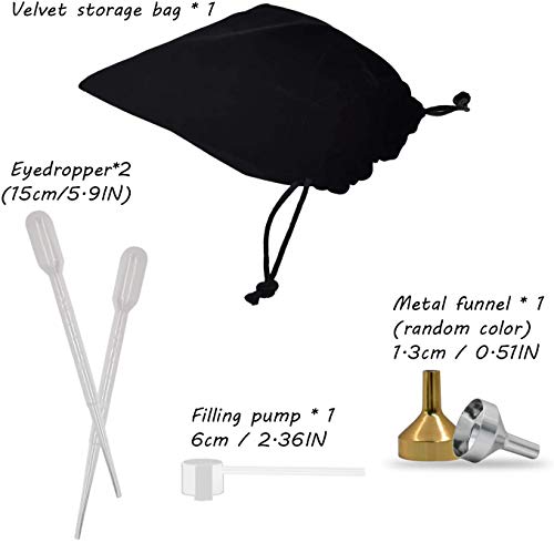 Flacone spray Dolovemk: 50 ml, altezza 13,3 cm, peso: 101 g, con 1 imbuto in metallo (colore casuale), 2 contagocce, 1 pompa per profumo, 1 sacchetto di velluto.
